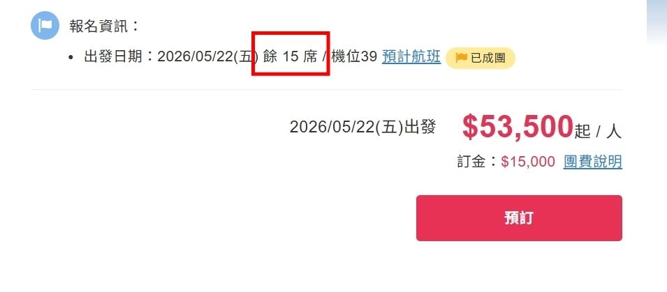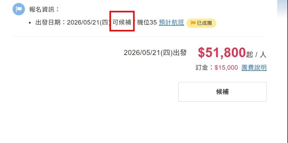21日滿團可候補、22日成團餘15位,